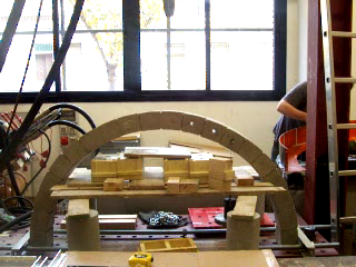 | Fallada d'una estructura de blocs per lliscament (sliding). Mireu com la dovella (voussoir) s'ha mogut respecte la resta dels arcs. Experiment fet al LITEM amb l'Ernest Bernat. |